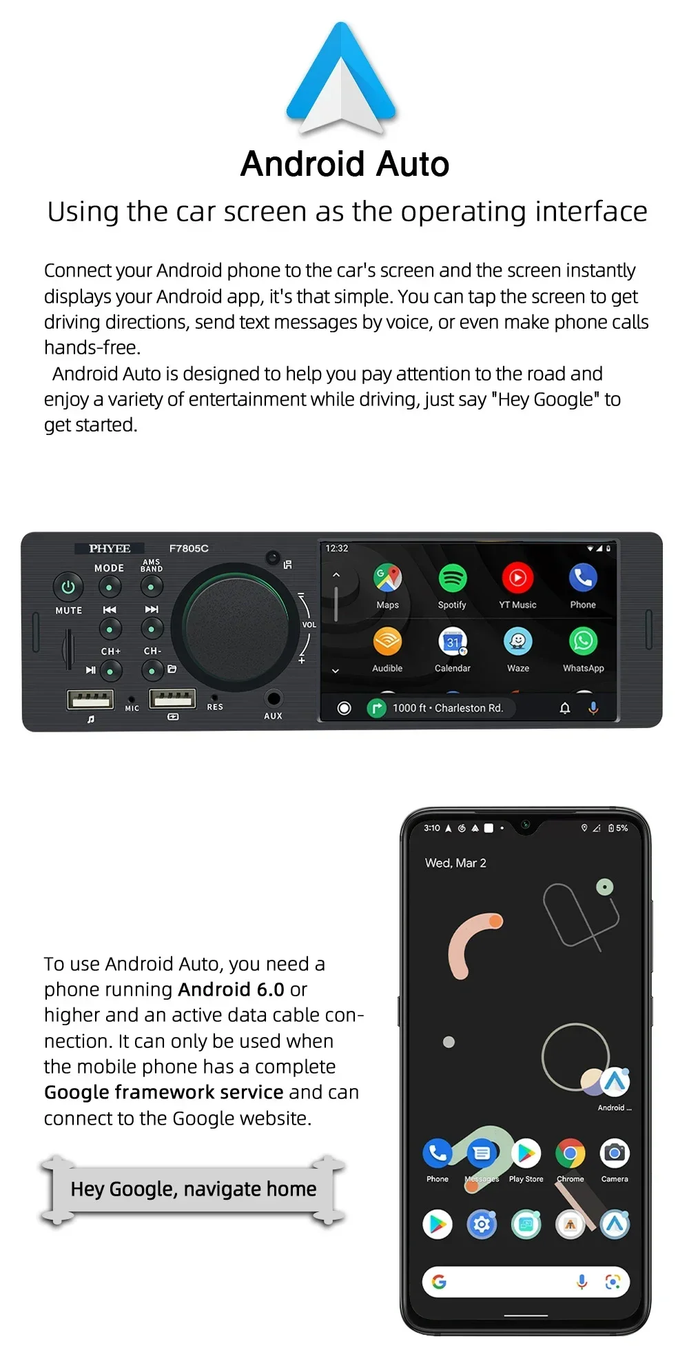 * Fil Android Auto (Port USB avant unicité)Pour téléphones Android