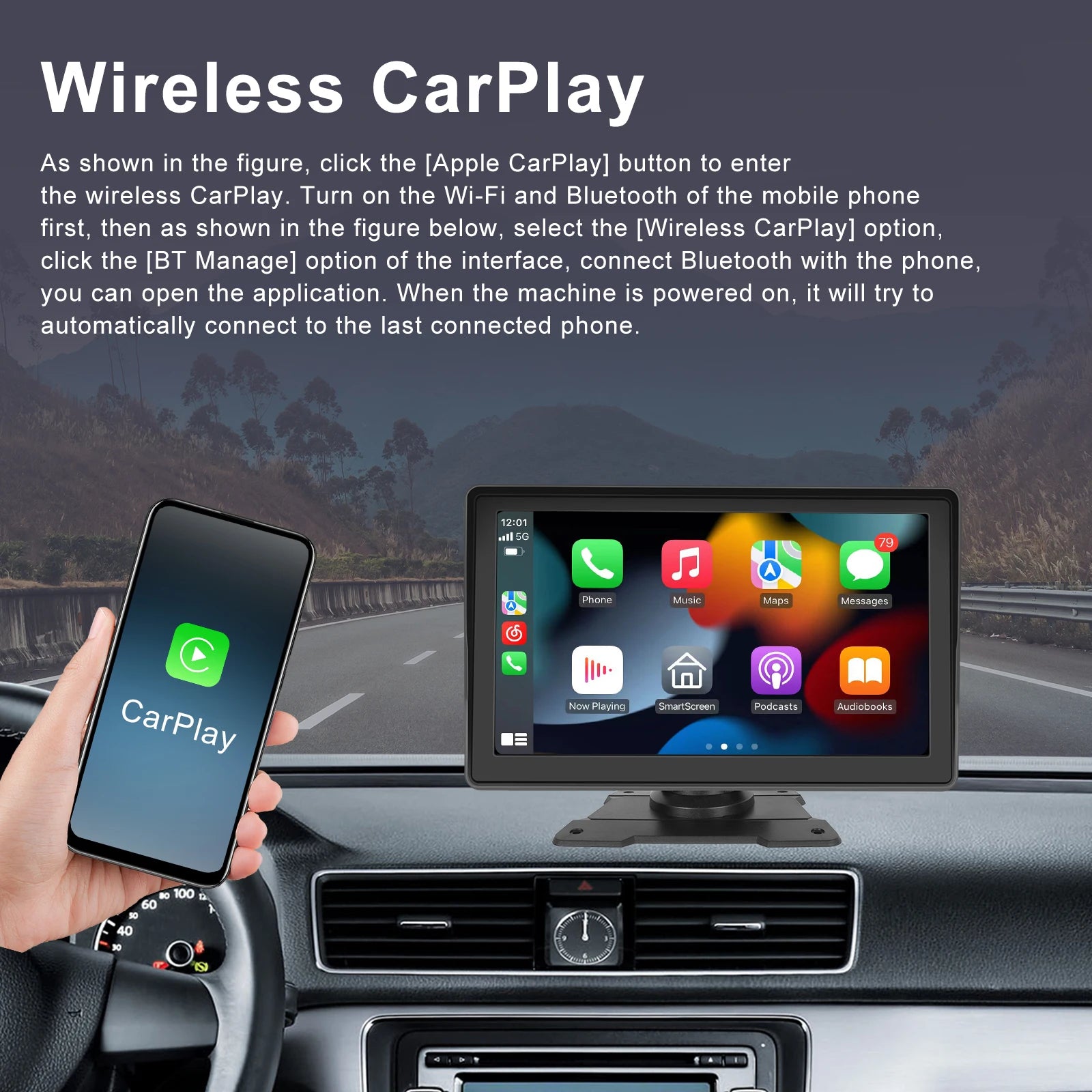 1.【Apple Carplay sans fil】 Vous n'avez pas besoin d'utiliser un câble de données. Il vous suffit d'activer le Bluetooth et le WiFi pour vous connecter, et Carplay se connectera automatiquement la prochaine fois. Vous pouvez utiliser la commande vocale Carplay pour écouter de la musique, naviguer, afficher des messages texte, etc. (iPhone uniquement).