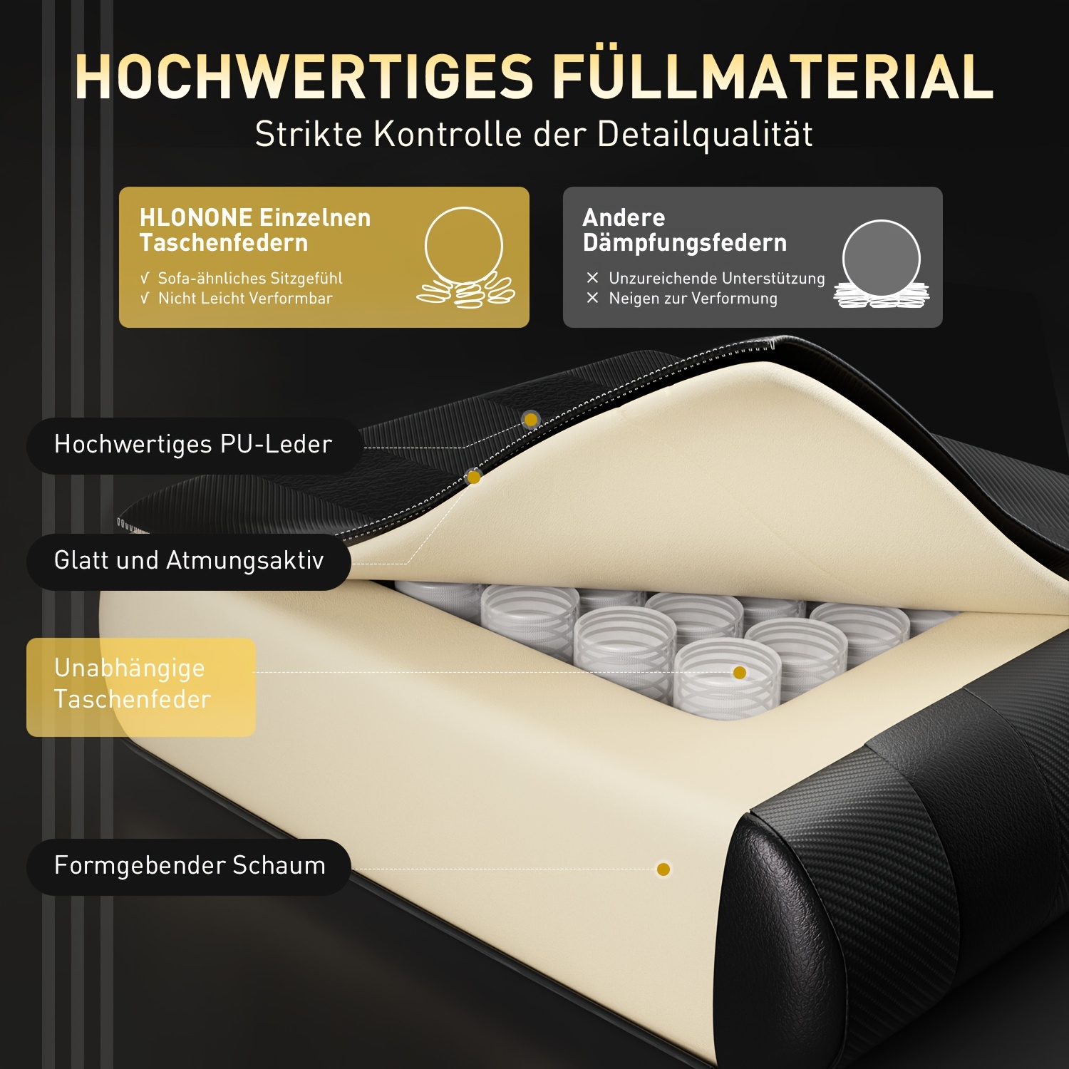 [Premium Materials] This gaming chair is upholstered in soft, breathable PU leather that's abrasion-resistant and easy to clean. The seat features high-Density Memory Foam for excellent comfort support. 30,000 deformation tests ensure the independent pocket springs' pressure distribution remains even while maintaining their elasticity over time